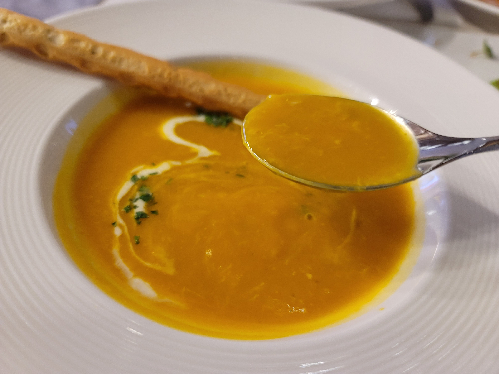 餐湯是南瓜蟹肉忌廉湯,在外面的餐廳南瓜湯都十分像粉水,但這間餐廳完全不一樣驚喜萬分!南瓜湯吃得出有南瓜肉和南瓜絲,而且湯來的蟹肉也吃得出來,配上脆脆的麵包條簡直感覺正宗!誇張地說,這是我吃過的南瓜湯最好味的一款!